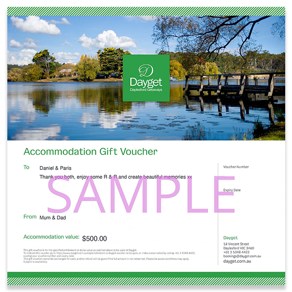 Gift vouchers can be issued for $100 or more and can be used as full or partial payment for accommodation. The gift voucher recipient can choose from any of the properties on the Dayget portfolio.